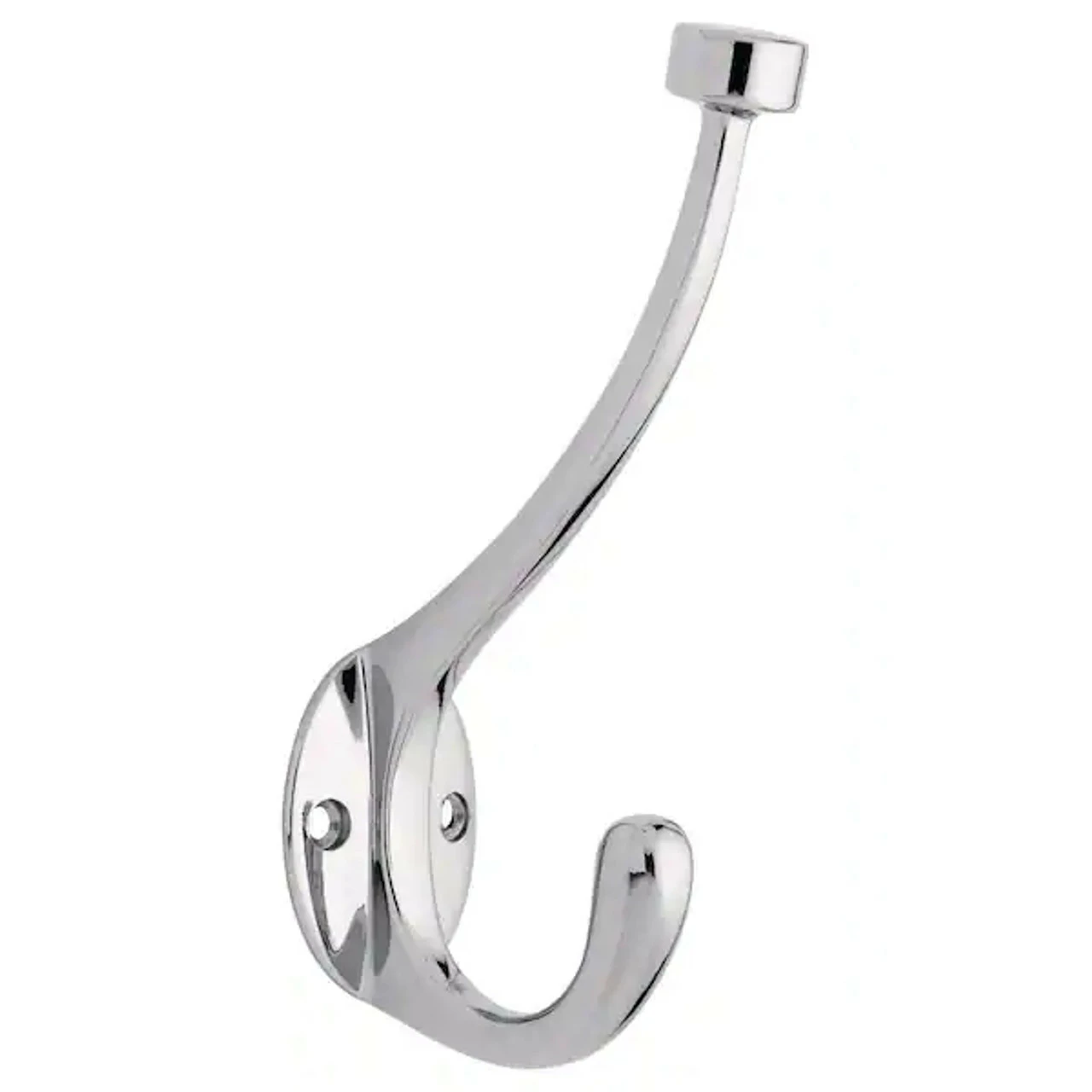 Pilltop two prong coat hook in polished chrome with mounting screws and instructions. Traditional styling front mount, recommend weight 35 lbs.