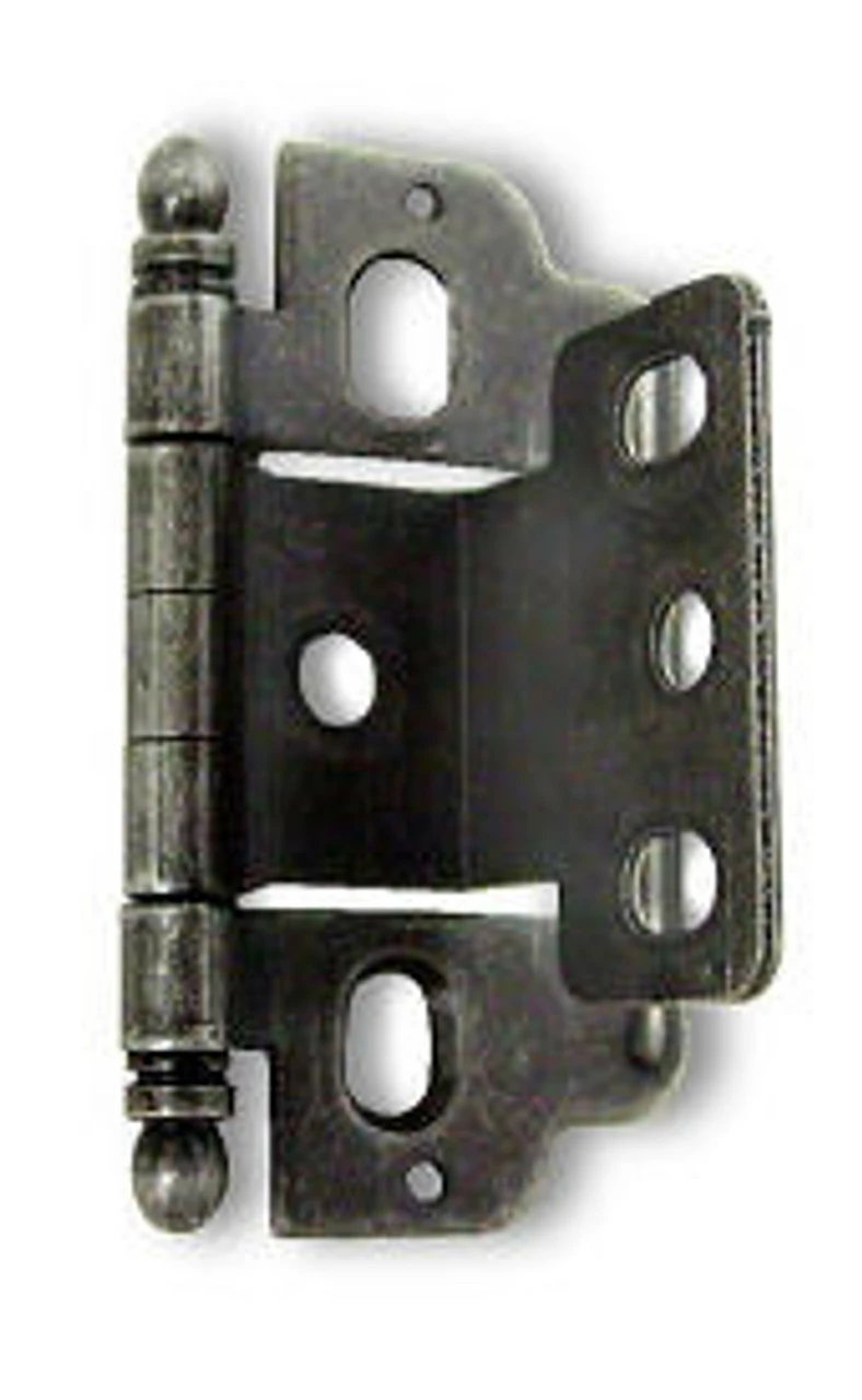 Premium Wrought Iron non-mortise wraparound hinge. This is a non-mortise, partial wrap-around (wraps around the back of the door for extra support) with decorative ball finials. This hinge is for a 1/2″ door mounted flush to a face frame style cabinet. The hinge has 4 adjustable slots for screws and comes with the screws necessary for mounting. The hinge can be adjusted using the slotted screw holes and locked into place using the non-adjustable slots.This hinge is for use on a face-frame style cabinets. Not for overlay doors. Think butt hinge with extra support, and you’ll understand how this hinge functions.