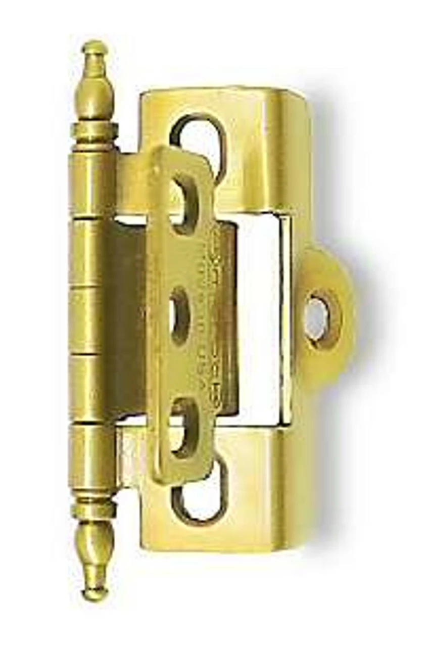 This is a non-mortise, double wrap-around (wraps around the back of the door and the base for extra support) hinge with decorative finials. This hinge is for a 9/16″ door mounted flush to a faceframe style cabinet. The hinge has 4 adjustable slots for screws and comes with the screws necessary for mounting. The hinge can be adjusted using the slotted screw holes and locked into place using the non-adjustable slots. This hinge has a classic antique English (or burnished brass) finish. Think butt hinge with extra support, and you’ll understand how this hinge functions.