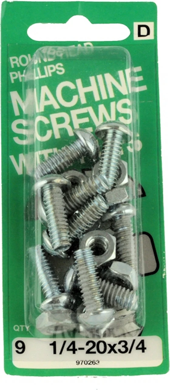 Hillman 1/4- 20×3/4″ Round Head Machine Screws With Nuts – 9 Pack