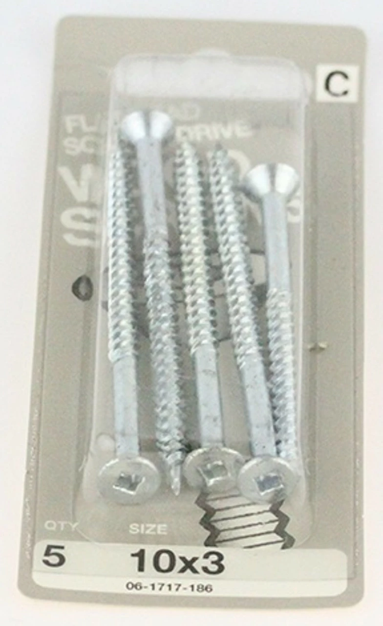 This is a 5 pack of 10 x 3 wood screws from Hillman Hardware. These wood screws are flat head and square drive. Comes in a pack just as pictured.