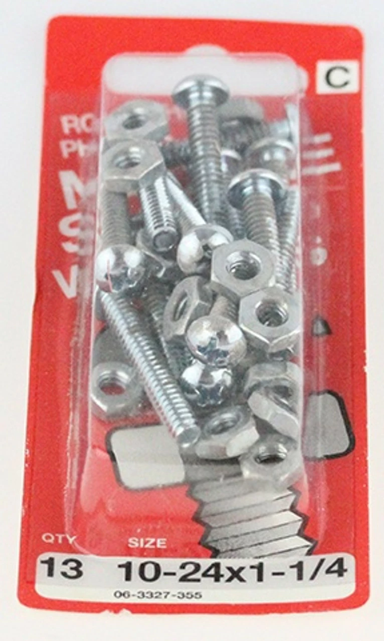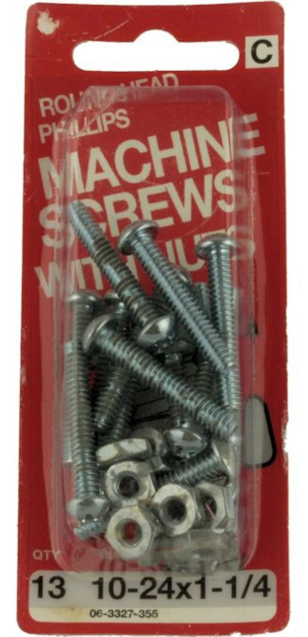 This is a 13 pack of machine screws with nuts measuring 10-24 x 1 1/4″. These screws are round head, phillips, and zinc plated.