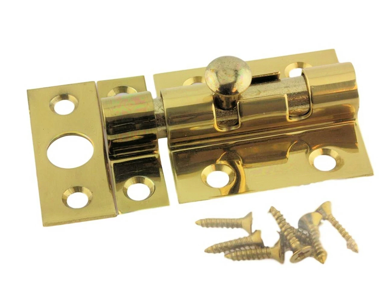 High Quality 1-3/4″ Barrel Bolt Lock is Solid Polished Brass and has a 3/8″ diameter bolt. Small but mighty. Comes with both surface mount and mortised mount strikes. Product ID: 766XC Style: Traditional Finish: Polished, Lacquer Solid Brass