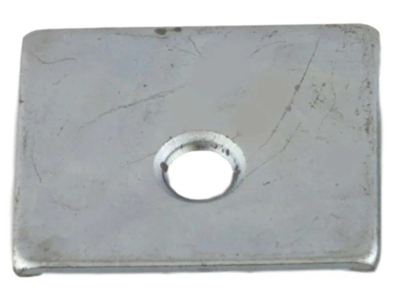 This strike plate is made out of stamped steel with a zinc plating finish.