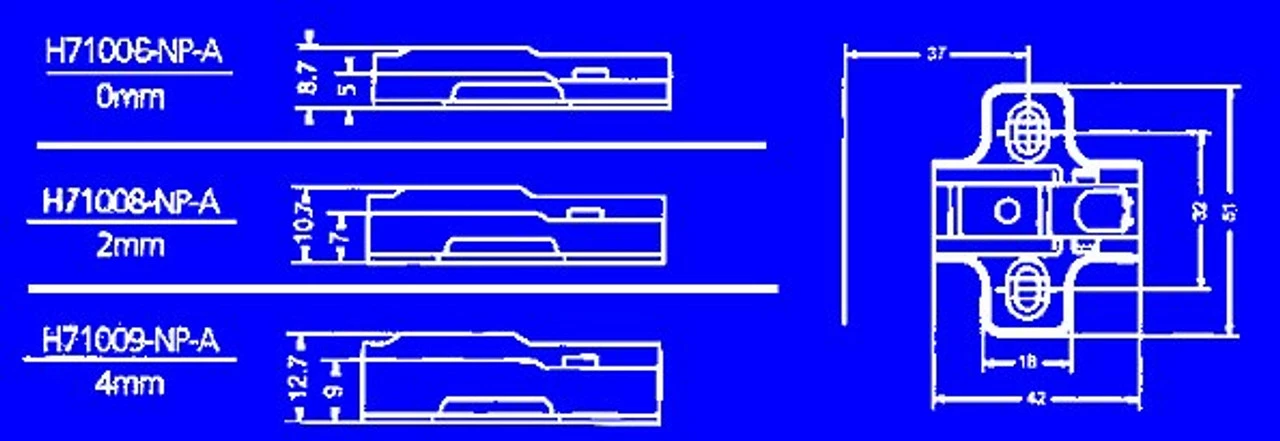 This mounting plate is part of the Liberty Easy-Clip concealed hinge system. The mounting plate is for 35mm hinges and requires wood screws. This mounting plate has a 2 mm rise, which reduces the overlay by 2 mm. Please see schematic drawing. Overall dimensions are 1 3/4″ x 2″ x 3/8″ (10.7mm) height.