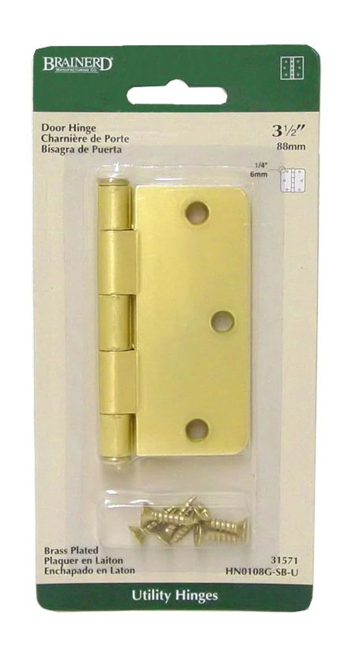 3-1/2″ 1/4″ Radius Round Corner Satin Brass Hinge. Carded with screws and mounting instructions. 1 per package.