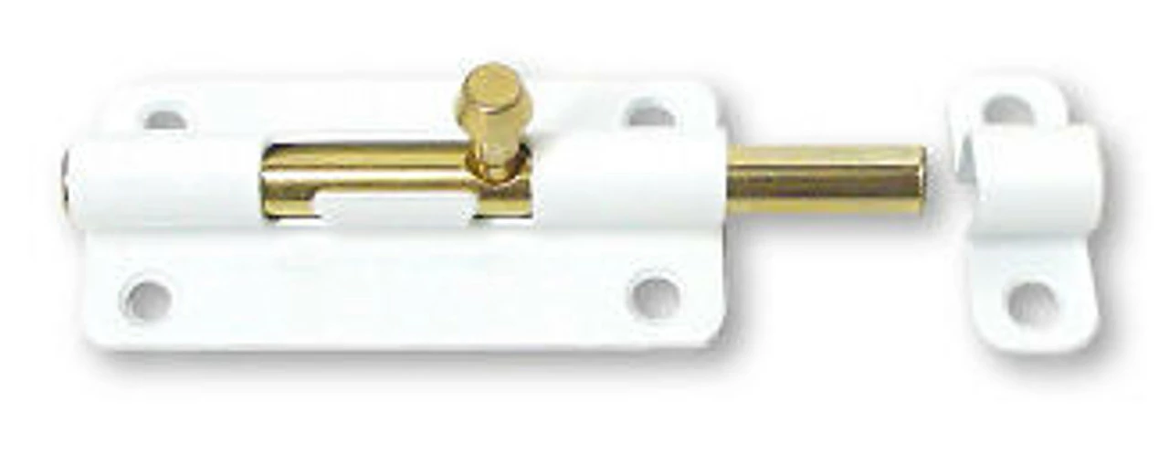 3-7/8″ Barrel Bolt lock has a 5/16″ diameter. Add security to your home, office, or apartment. Comes with a surface mount strike. White epoxy and brass gives a quality finished look.