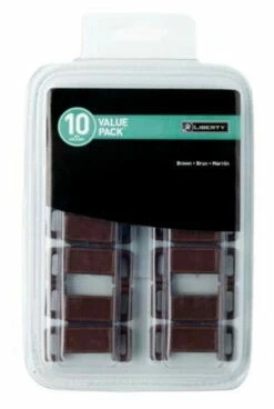 10-pack of magnetic catches. Each catch includes a heavy-duty magnet enclosed in a brown plastic housing and a steel strike plate. Rated for up to 6 lbs. of pull force.