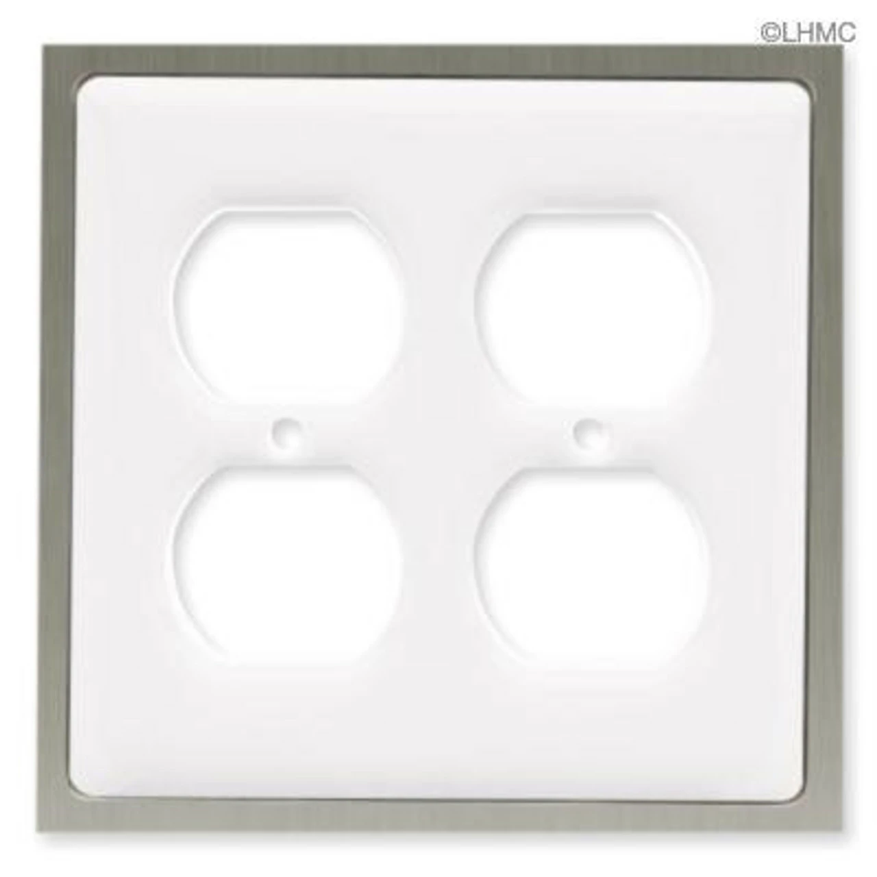 Casual Collection Betsy Fields Design Double Duplex Outlet Wall Plate in white ceramic and chrome trim. This wall plate cover with a touch of chrome is very classy and classic. This heavy and highly attractive ceramic Double Duplex Outlet Plate with a chrome border will be perfect for your home renovation project or at the office. The additional chrome frame makes this cover 1/4″ larger than standard covers,just like some of the fancy decorative wall plates, so it would handily disguise a little damage around the switch box if need be. Comes with 3/4″ mounting screws Liberty Hardware Limited Lifetime Guarantee This wall plate is for standard wall Duplex Outlets.