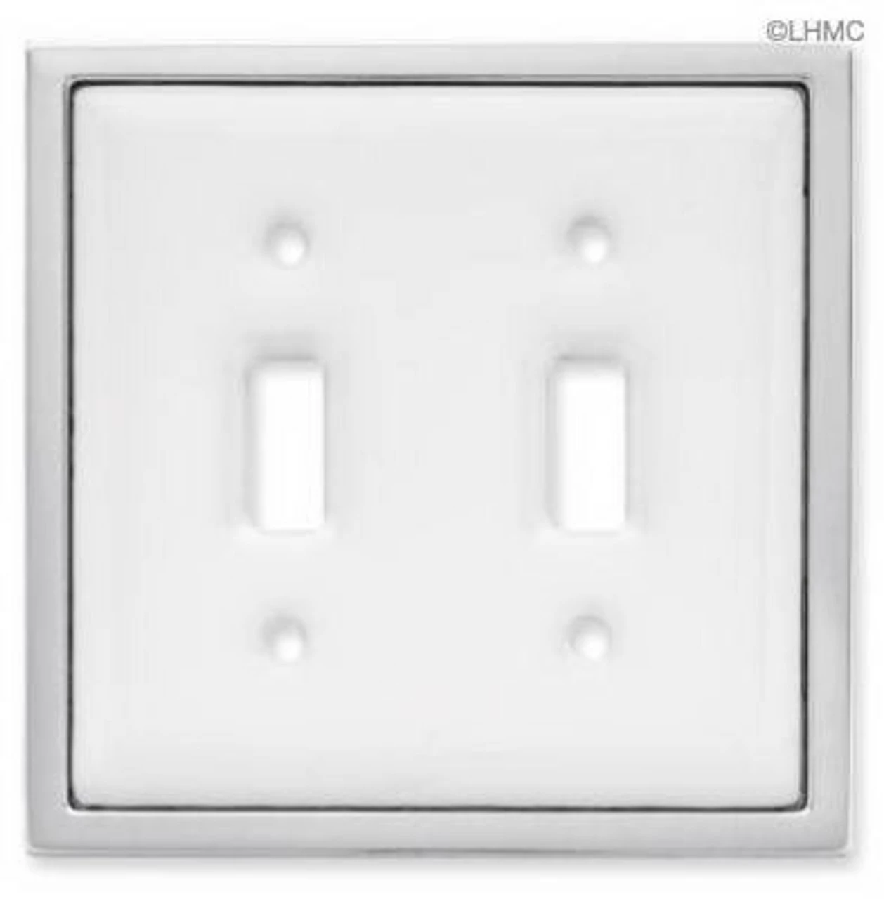 Casual Collection Betsy Fields Design Switch plate in white ceramic and chrome trim. This wall plate cover with a touch of chrome is very classy and classic. This heavy and highly attractive ceramic double switch wall plate with a chrome border will be perfect for your home renovation project or at the office. The additional chrome frame makes this cover 1/4″ larger than standard covers,just like some of the fancy decorative wall plates, so it would handily disguise a little damage around the switch box if need be. Comes with 3/4″ mounting screws Liberty Hardware Limited Lifetime Guarantee This wall plate is for standard wall toggle switch.