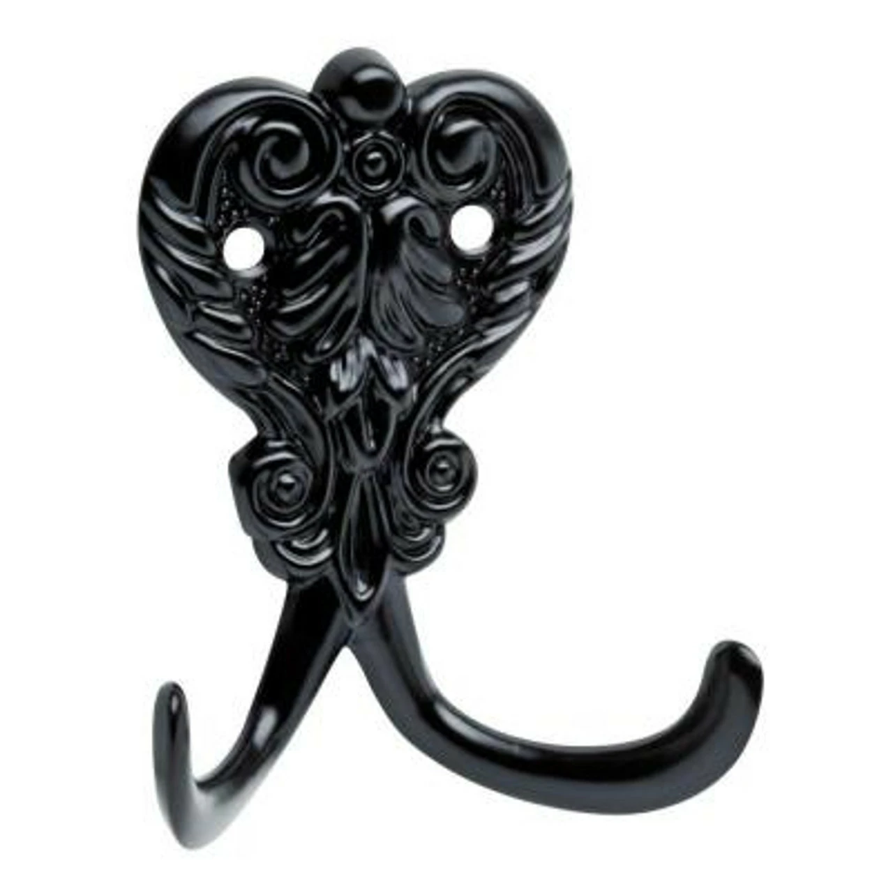 Vintage style flat black double coat hook with ornate design pattern. Flat black goes well with any home decor and can really accent your space.