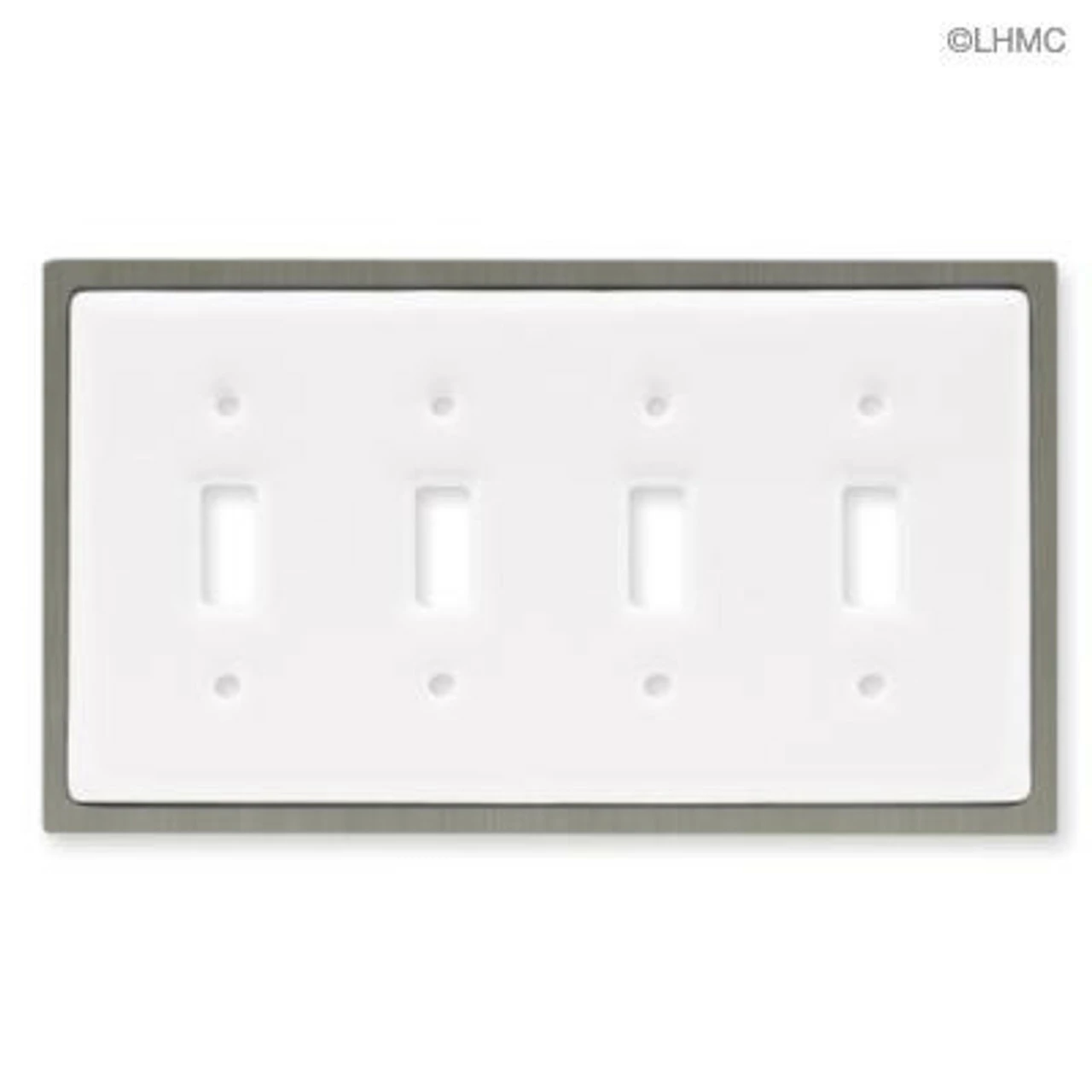 Casual Collection Betsy Fields Design Quad 4 Switch Plate in white ceramic and chrome trim. This wall plate cover with a touch of chrome is very classy and classic. This heavy and highly attractive ceramic four switch wall plate with a chrome border will be perfect for your home renovation project or at the office. The additional chrome frame makes this cover 1/4″ larger than standard covers,just like some of the fancy decorative wall plates, so it would handily disguise a little damage around the switch box if need be. Comes with 3/4″ mounting screws Liberty Hardware Limited Lifetime Guarantee This wall plate is for standard wall toggle switch.
