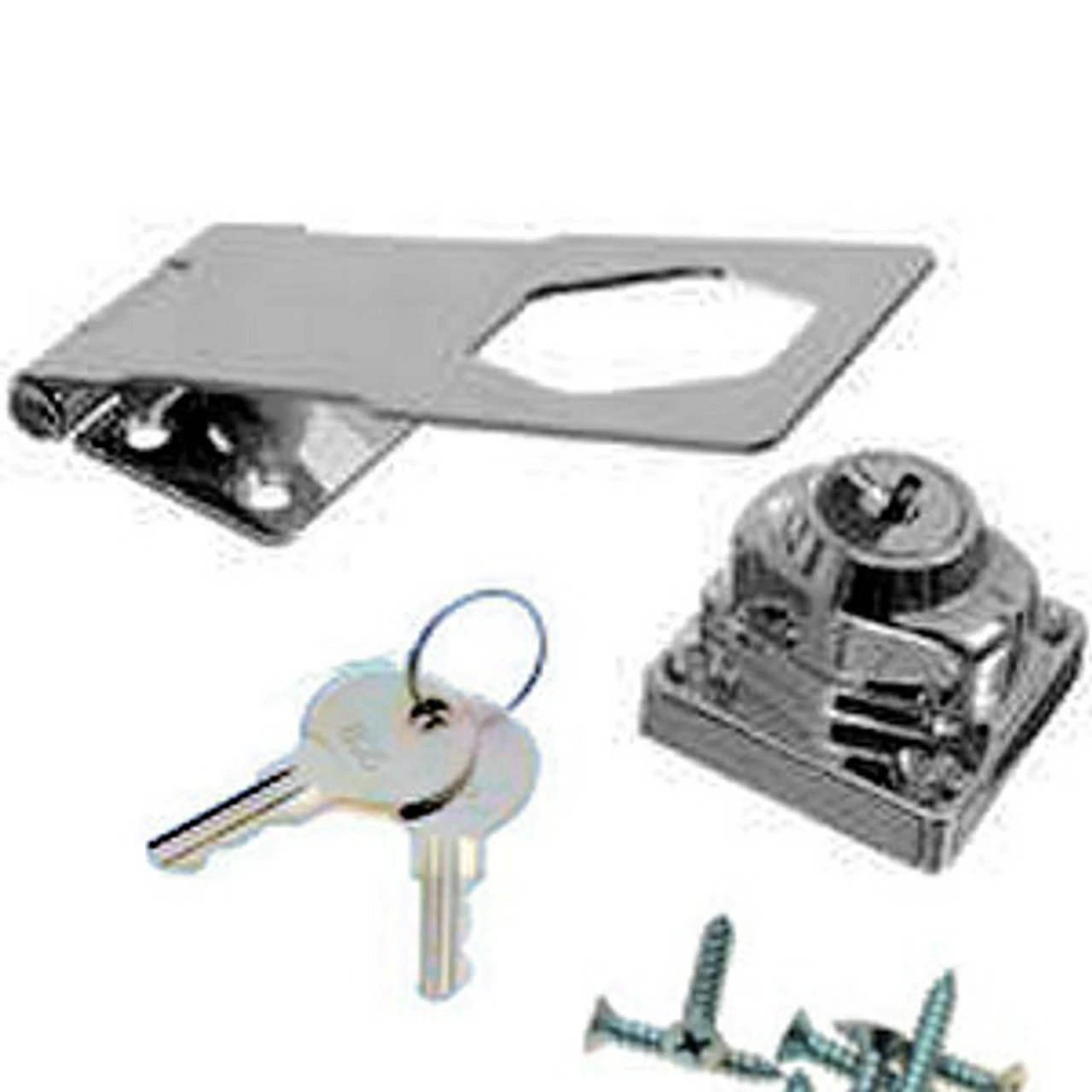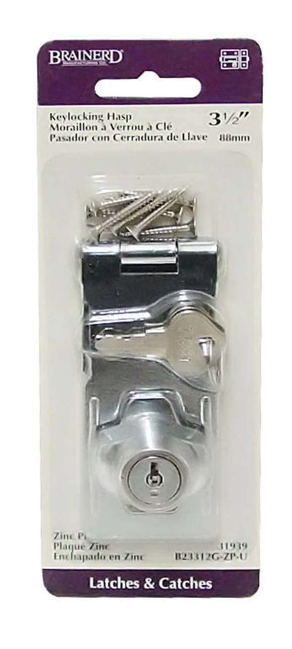 Key Locking Bright Zinc Plated Hasp Key lock for security – Latching with out locking. Overall length 4″ x 1 5/8″ For cabinets, chests, doors, sheds, and lockers. All screws concealed when hasp is locked. All mounting hardware included. Two Keys Brainerd Hardware