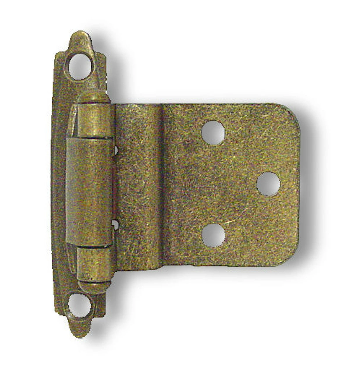 Surface Mount Hinge – 3/8″ inset – semi concealed, self-closing – Antique Brass. Comes with screws and bumpers. Priced in pairs.