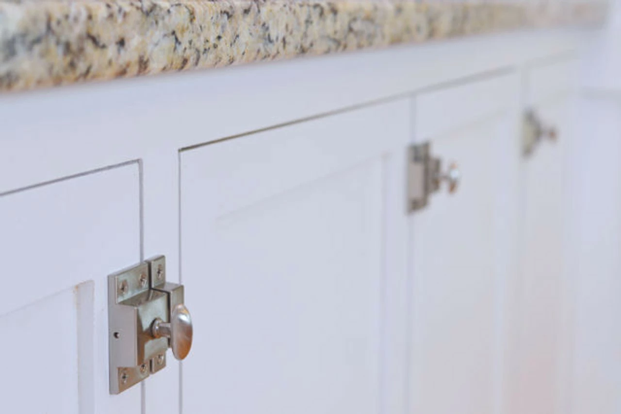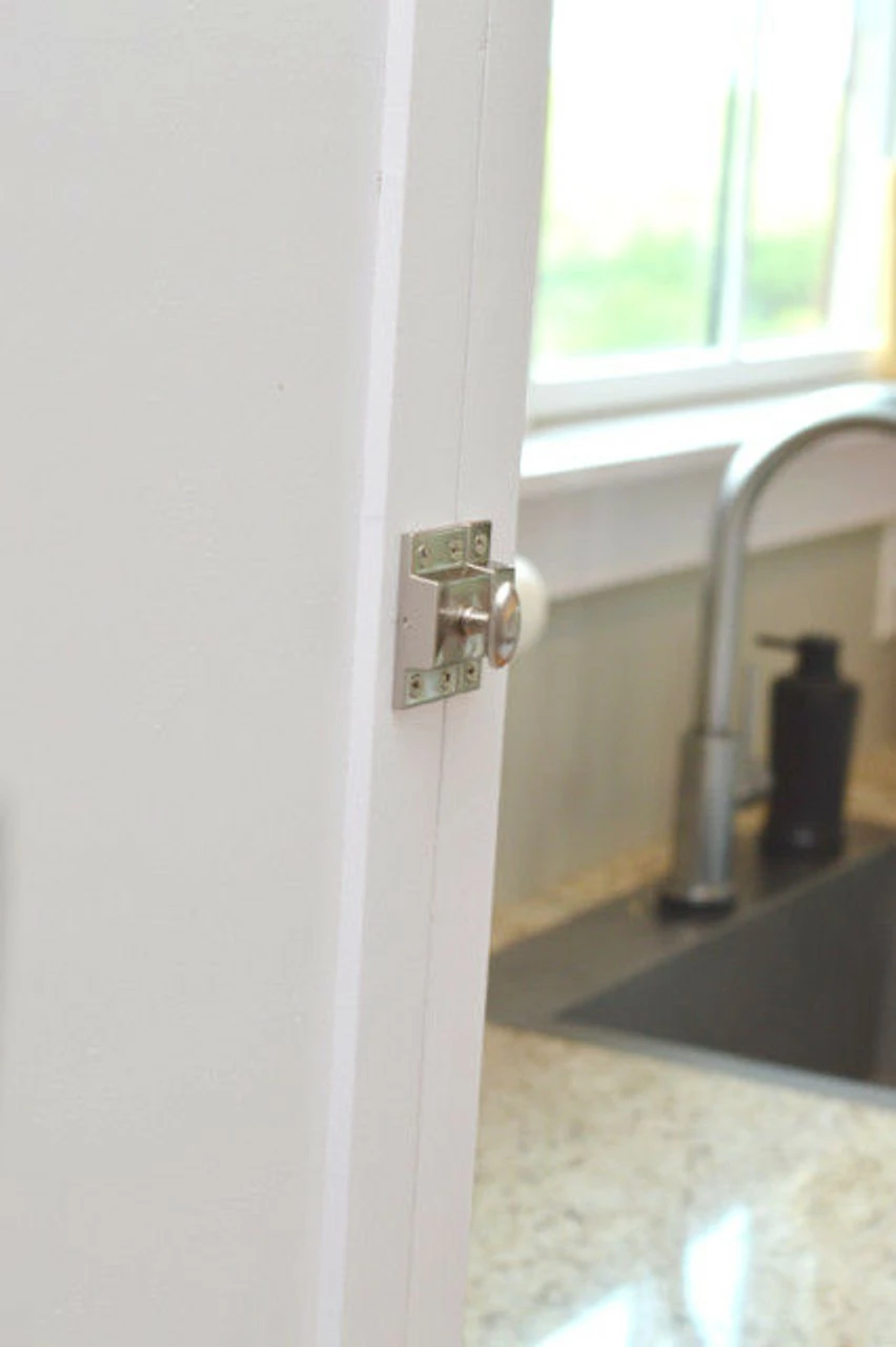 From Liberty Hardware, the Matchbox Catch provides vintage style for this surface mount cupboard latch. Made of stamped steel, and plated with a satin nickel finish, this latch is spring loaded, so with a turn of the knob the latch is retracted allowing the door to be opened. Installation hardware is included. This lovely little satin nickel latch was recently used rather creatively at the homemaking blog Newly Woodwards. In their white kitchen they matched this latch with satin nickel cup pull number L-PN0602-SN-C.