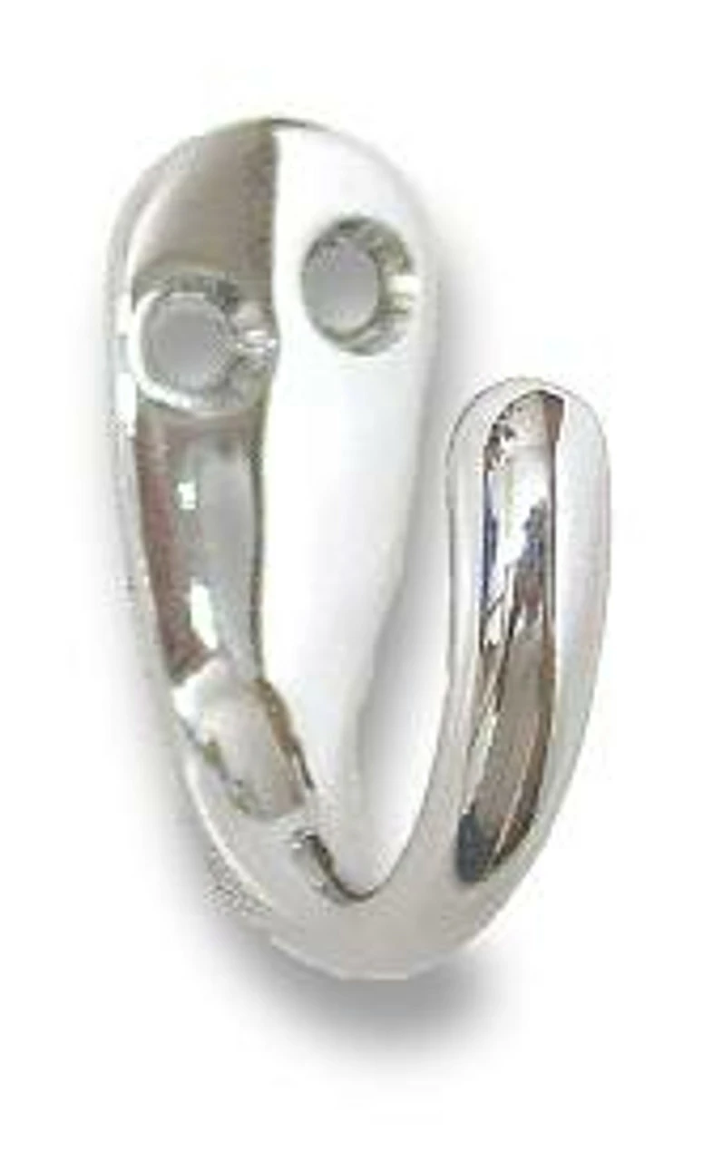Single Hooks in bright chrome finish. Set of two in hanging consumer retail blister pack with matching screws. 1-3/4″ top-to-bottom, extends 1-1/2″, mounting plate 7/8″ wide. Home Trends by Brainard Hardware