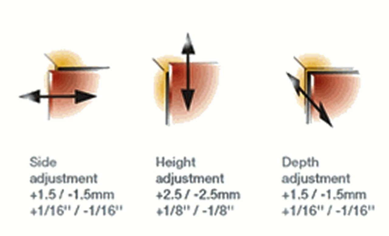 - Builder’s European style compact one piece hinge. Mounting plate and hinge are one easy to install unit.