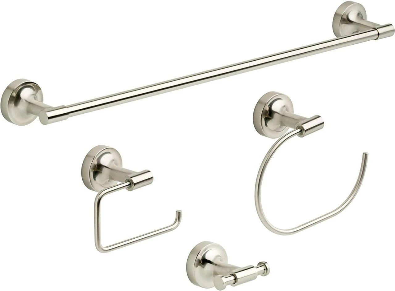 Includes: 24″ Towel Bar, Towel Ring, Toilet Paper Holder, Robe Hook