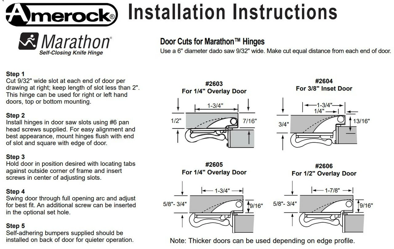 Marathon Amerock Self-Latching Knife Hinge For 1/2″ Overlay. Use with 5/8′-3/4″ thickness doors. For face frame cabinets only. Fits left or right hand doors, top or bottom– same hinge. Purchase 2 hinges per door. Individual price, not pairs. Top or bottom mounting. Full wrap mount square door. Slotted holes for adjustment 3/16″. Single pivot for 180 opening. Marathon hinges are guaranteed as long as you own your home.