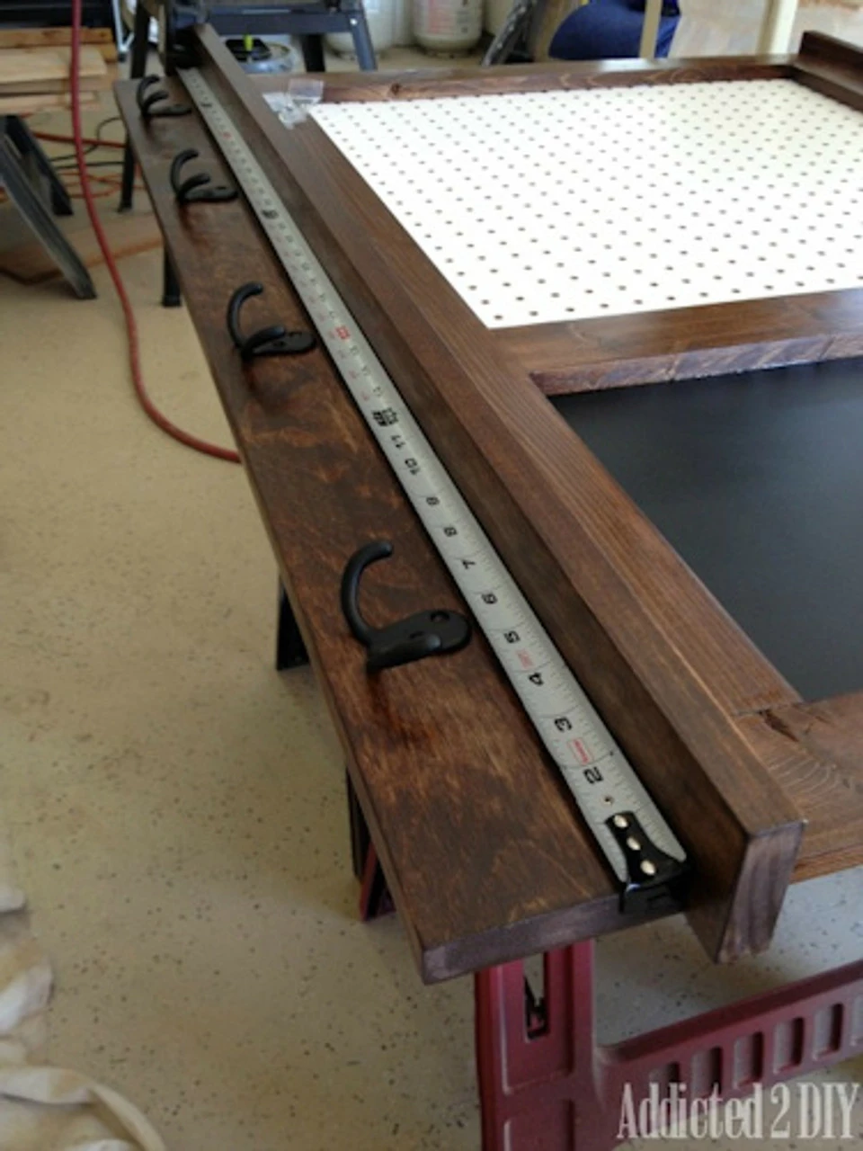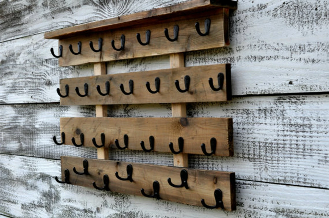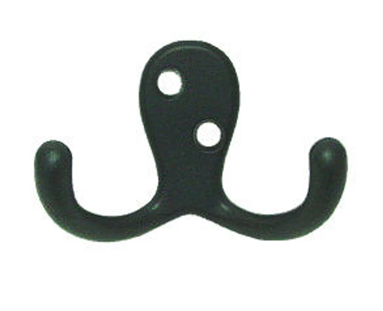 Simple but elegant matte black epoxy finish double pronged hook. This small two pronged hook is perfect for a variety of ideas. In additional images you can see this hook used very creatively in a post about making your own pegboard organizer at Addicted 2 DIY. We’ve a few more nice shots from customer and Etsy seller Reclaimed Oregon. They are very highly rated and sell custom wedding and home decor so give them a look! And used again on the nice refurbishing and DIY blog My Repurposed Life on a cabinet door coffee mug rack.